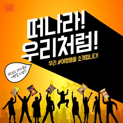 안녕하세요! ‘떠나라 우리처럼 이벤트’ 당첨자를 발표합니다. 나의 여행팸을 소개하고 사진 올려주신 분들께 정말 감사드립니다:) 당첨자 3명입니다. [당첨자 3명] 임유리 https://www.facebook.com/IMYOURI?fref=ufi&rc=p 박다은 https://www.facebook.com/profile.php?id=100009331956712&fref=ufi&rc=p 허정윤 https://www.facebook.com/jung.heo.777?fref=ufi&rc=p ■ 코스모스제과 페이스북 메시지로 아래 형식에 맞춰 9/30(일)까지 정보를 보내주세요. ■성함/페이스북이름/휴대폰번호/